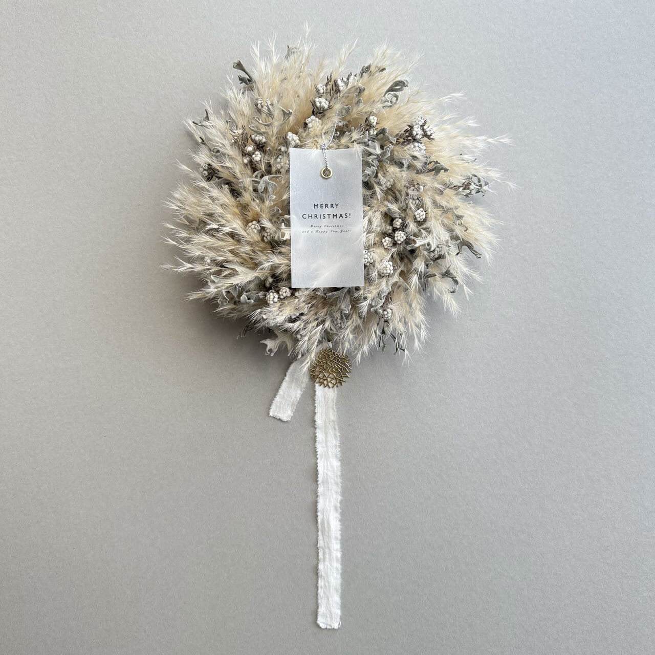 三重県産のパンパスグラスを使用した、クリスマスにもピッタリのホワイトリースです。もちろんクリスマスカードを外せば年中お楽しみいただけます。