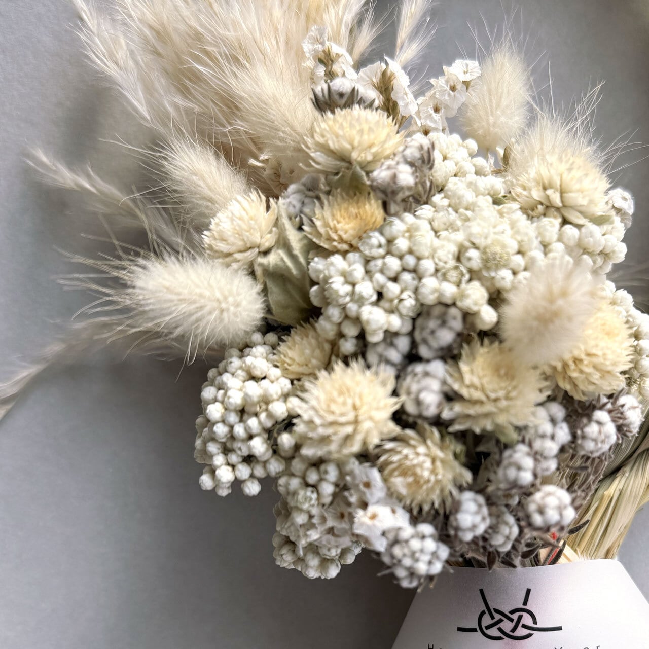 【素材】稲わら、ドライレモングラス、ドライパンパスグラス、ドライ千日紅、ドライラグラスバニーテール、ドライハイブリッドスターチス、ドライライスフラワー、ドライフィリカコットンブッシュ、タッセル、リボン