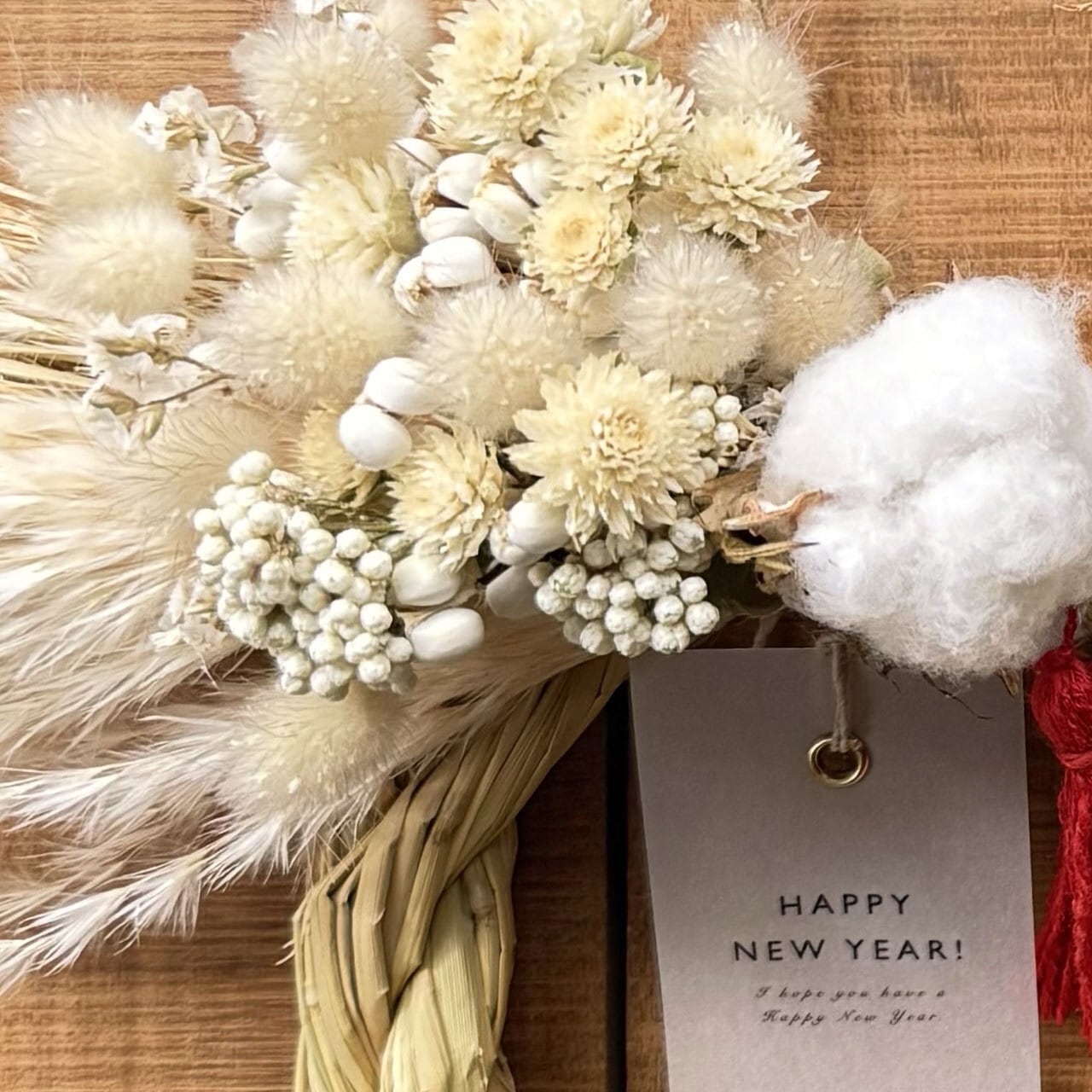 【素材】稲わら、ドライパンパスグラス、ドライコットンフラワー、ドライラグラスバニーテール、ドライ千日紅、ドライライスフラワー、ドライハイブリッドスターチス、タッセル