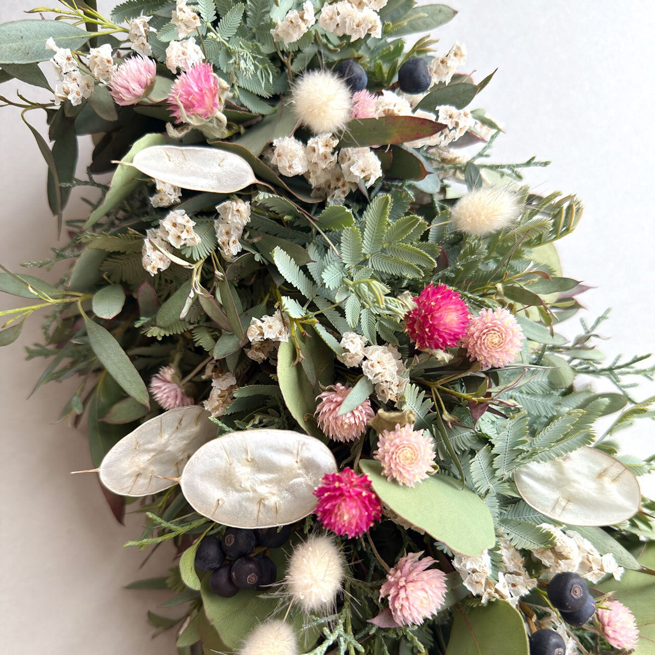 【素材】ドライユーカリグニー、ドライユーカリポポラス、ドライミモザリーフ、ドライブルーアイス、ドライHBスターチス、ドライ千日紅、ドライシャリンバイ、ドライラグラスバニーテール、ドライルナリア