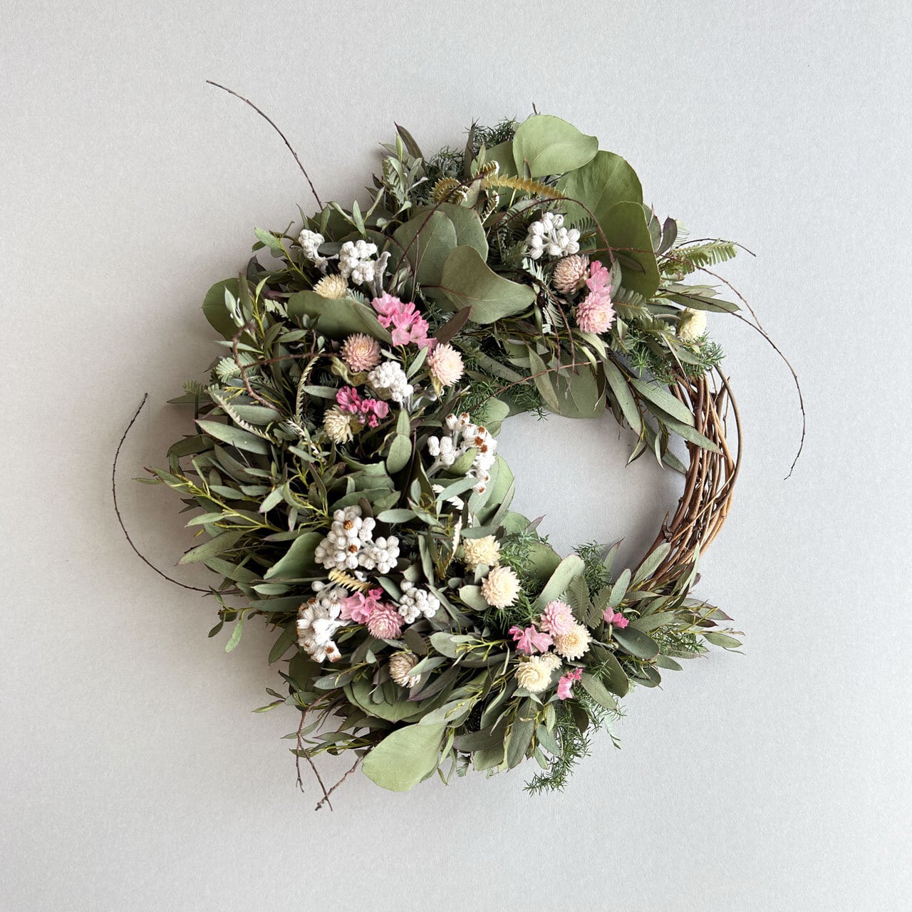 【素材】ドライユーカリグニー、ドライユーカリポポラス、ドライヒムロスギ、ドライミモザリーフ、ドライアンドラリーフ、ドライスターチス、ドライ千日紅、ドライシロタエギク、木の枝、リース土台
