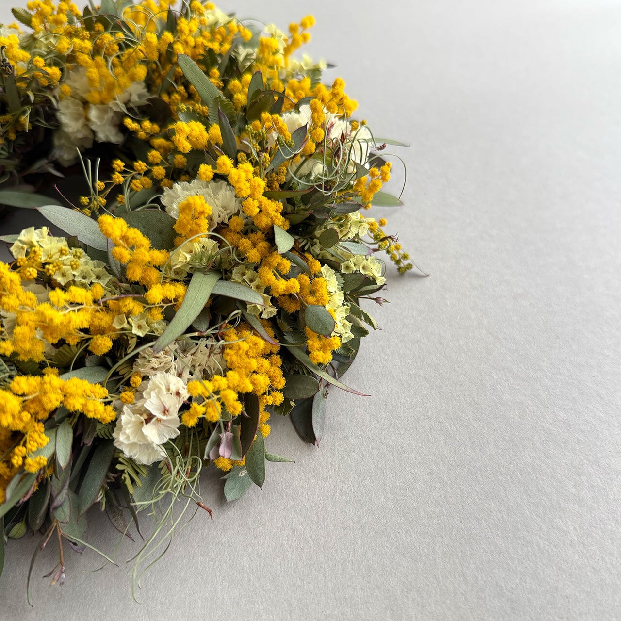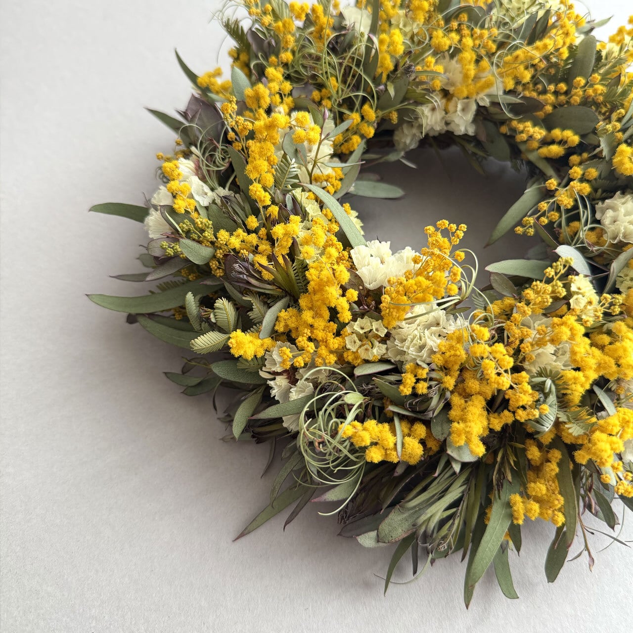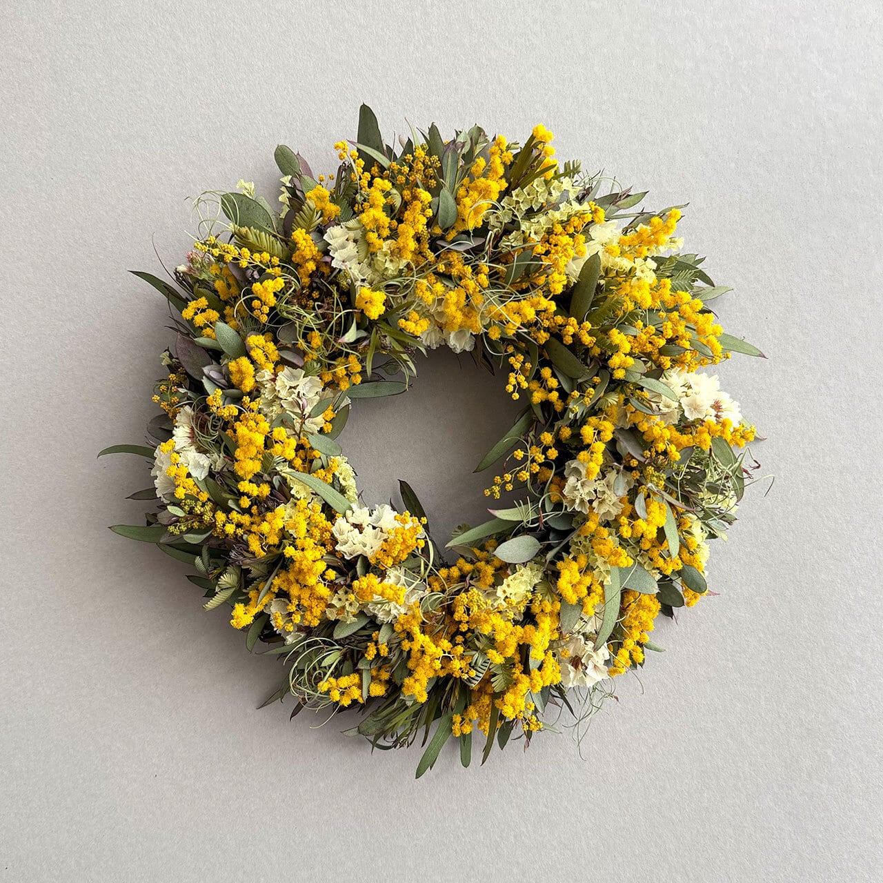 【素材】ドライミモザ、ドライスターチス、ドライHBスターチス、ドライユーカリグニー、ドライユーカリニッコリー、ドライゴアナクロー、リース土台