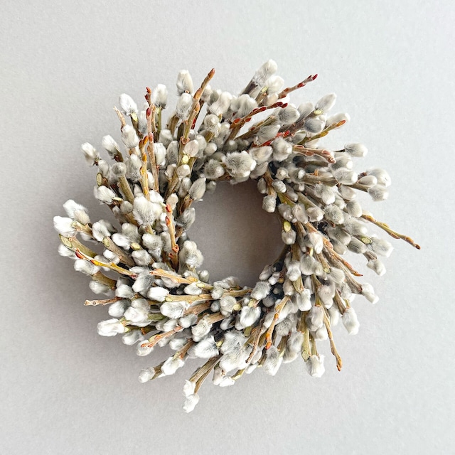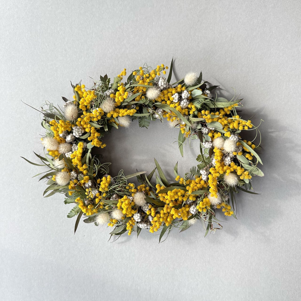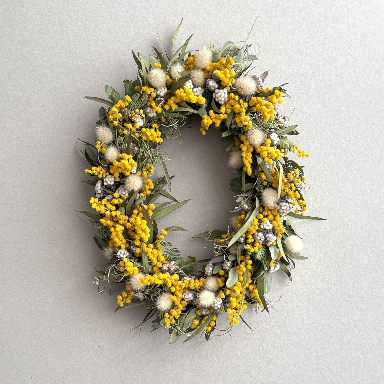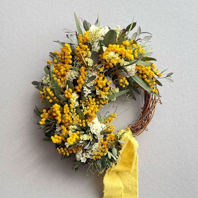 ミモザのオーバル型リース。縦・横どちらでも飾れる仕様です。
