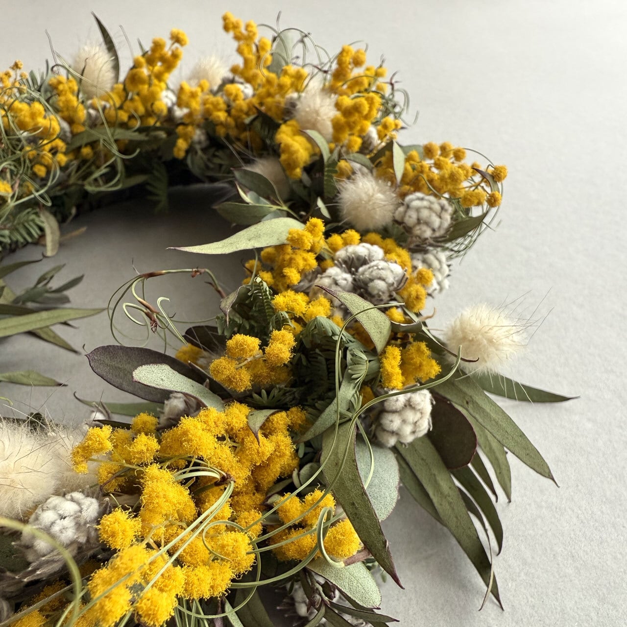 【素材】ドライミモザ、ドライユーカリグニー、ドライユーカリニッコリー、ドライゴアナクロー、ドライフィリカコットンブッシュ、ドライラグラスバニーテール、リース土台