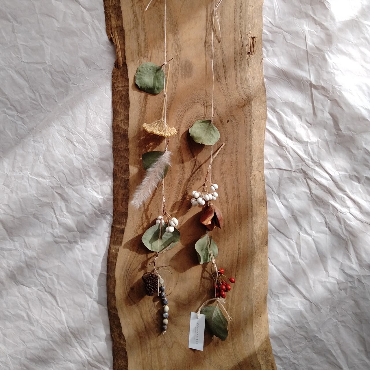 木の実やリーフを使用した縦長のドライフラワーガーランドです。椿の枝に金色のカラーリングをほどこしました。
