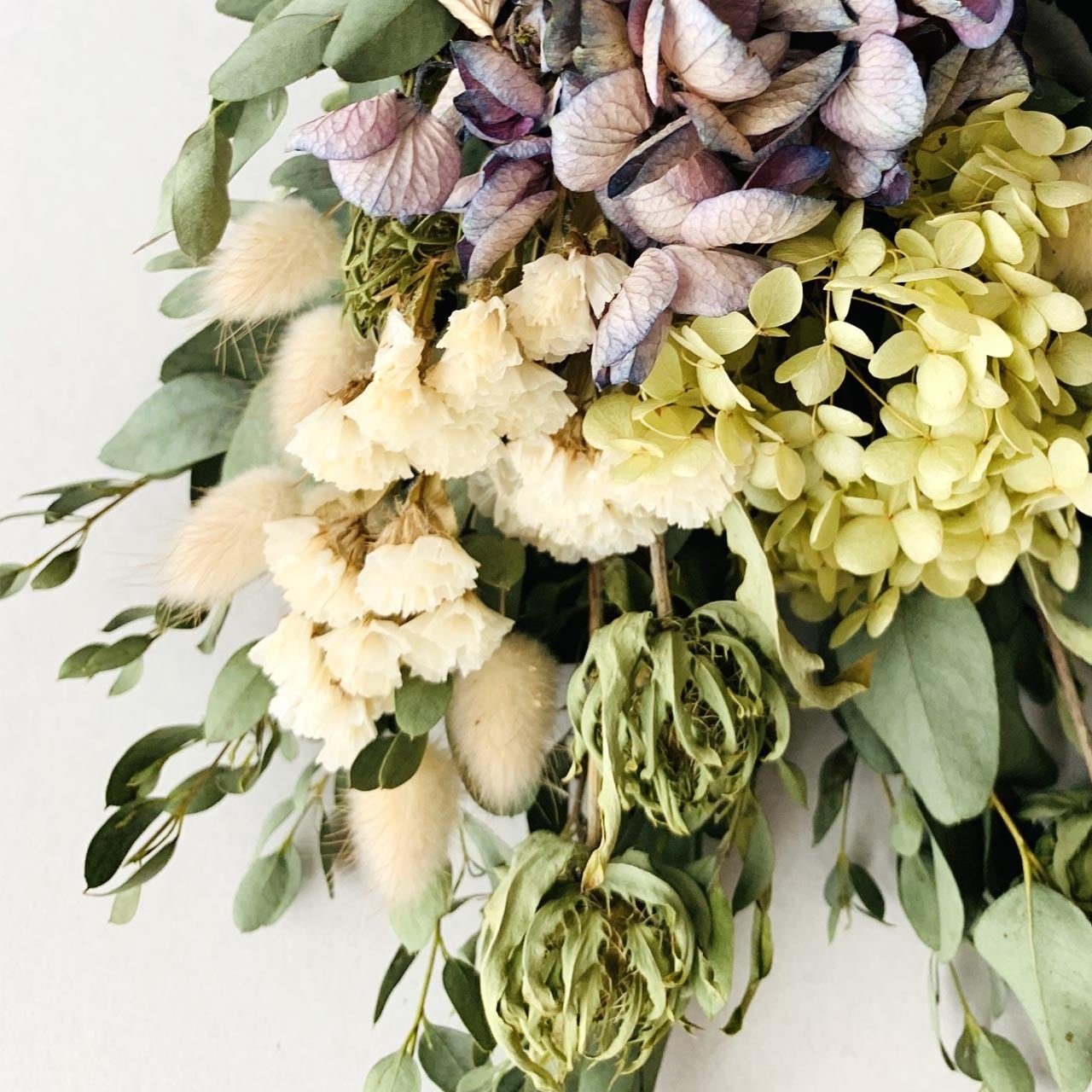 【素材】ドライ紫陽花、ドライアナベル、ドライユーカリグニー、ドライストケシア、ドライスターチス、ドライラグラスバニーテール、リネンリボン