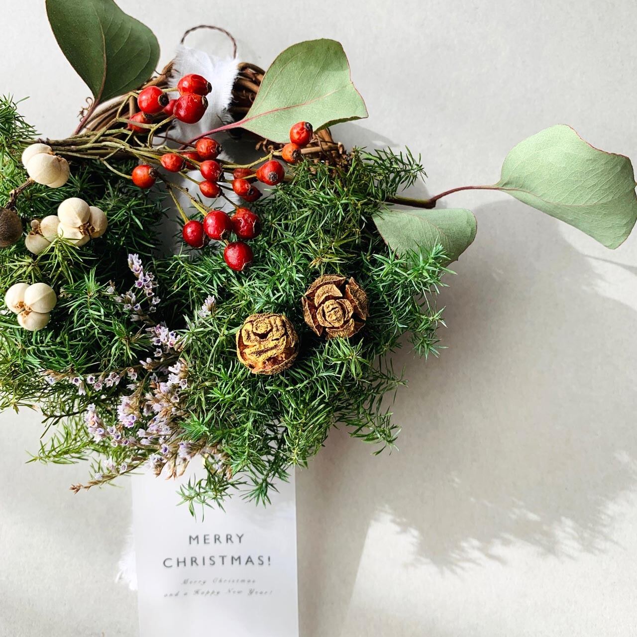 ユーカリポポラスと野バラの実を添えたクリスマスハーフリース(ミニサイズ)