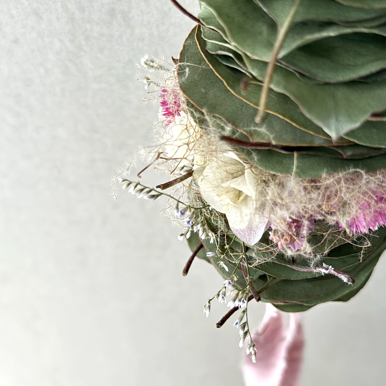 【素材】ドライポポラスリーフ、ドライ千日紅、ドライスターチス、ドライスモークツリー、ドライオレガノケントビューティー、リボン